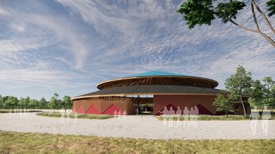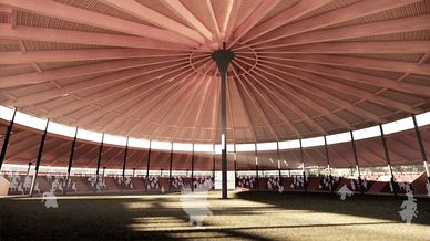 Interiour view of the 60 meter Pow wow field and seating area. ©LOLA Architecture